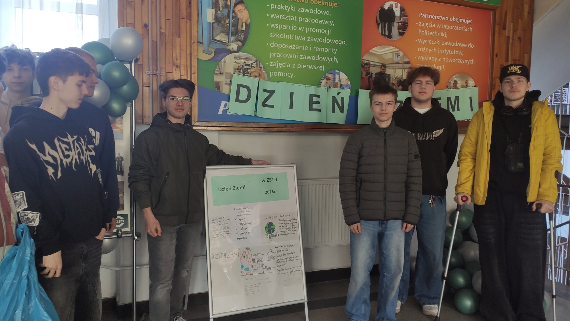 W Zespole Szkół Techniczno‑Informatycznych obchodzono Dzień Ziemi, angażując uczniów w działania proekologiczne. Zorganizowano akcję sprzątania terenu wokół szkoły, podczas której młodzież zbierała śmieci i porządkowała najbliższe otoczenie placówki. Przeprowadzono również quiz ekologiczny sprawdzający wiedzę uczniów na temat ochrony środowiska. Dodatkowo odbyła się lekcje poświęcona tematyce ekologii, podczas której omawiano znaczenie troski o planetę oraz sposobach dbania o środowisko na co dzień.